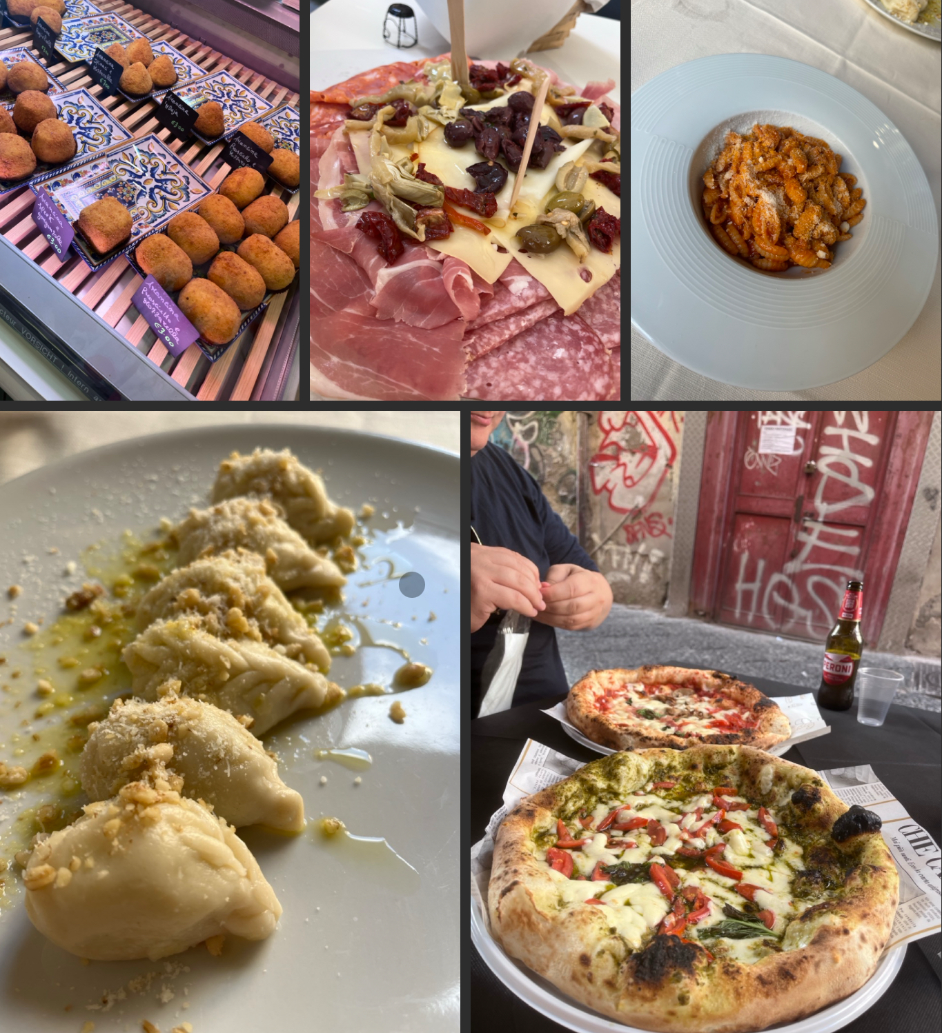 Pizzeria 400 Gradi– Now this was my first time exploring Naples so the only thing i needed to tick off was Pizza. I was in the home of Pizza after all. We disembarked the cruise, leaving behind the swarms of people heading off on their excursions to Amalfi and Pompeii in search of a culinary excursion… Authentic Napoleon pizza. Now my partner made it his mission to not fall into any pizzeria or fill up on the fritto misto cones, but again, we arrived pre-midday at a restaurant that looked sketchy but promised to be the best. It did not disappoint! With our language barrier, we eventually managed to order. Our order: La porcini (crema di funghi porcini, prosciutto cotto, fior di latte, basilico e olio) and La peste (pomodoro, fior di latte, pesto, salsiccia, basilico e olio).