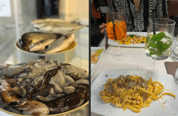 Upon arrival, we ordered a traditional Aperol and Hugo Spritz. Just before our meal, traditional Sicilian musicians serenaded us, making the evening even more special.