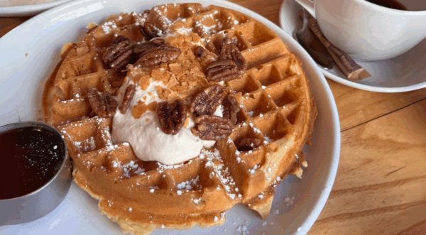 Moving on to a sweet dish we selected the Buttermilk Waffles. This had a chai mascarpone cream, toasted feuilletine, candied pecans and maple syrup all over it! Utterly indulgent would be the two words I would use if I could describe this dish. The waffles were light and fluffy but with a crunchy top and as someone who isn’t normally a fan of the flavour chai, the chai mascarpone cream won me over! Admittedly, I went back for a little bit more than my allocated portion.