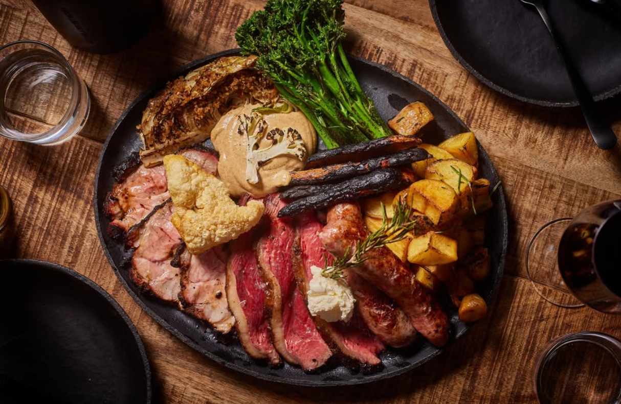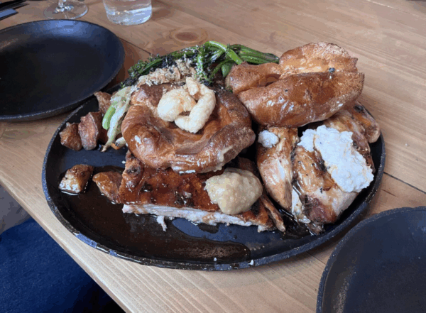 The main event is a wood fired sharing roast platter which is great if you’re close enough with the person next to you to divvy up the roast potatoes evenly! But not so great on a first date… My partner and I went for the Ember-roasted pork loin with apple sauce and crackling (resembling a Quaver) and the smoked half chicken with bread sauce. The chefs meticulously worked on hispi cabbage, glazed carrots, and broccoli over a crank mechanism to achieve the ideal heat and smoke, while roast potatoes sizzled in skillets inside a Gozney wood-fired oven. Our friends took on the indulgent Four Beast Feast, featuring pork belly, beef rump, lamb & mint sausage, and chicken — a true showstopper!