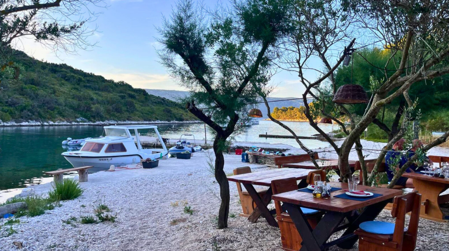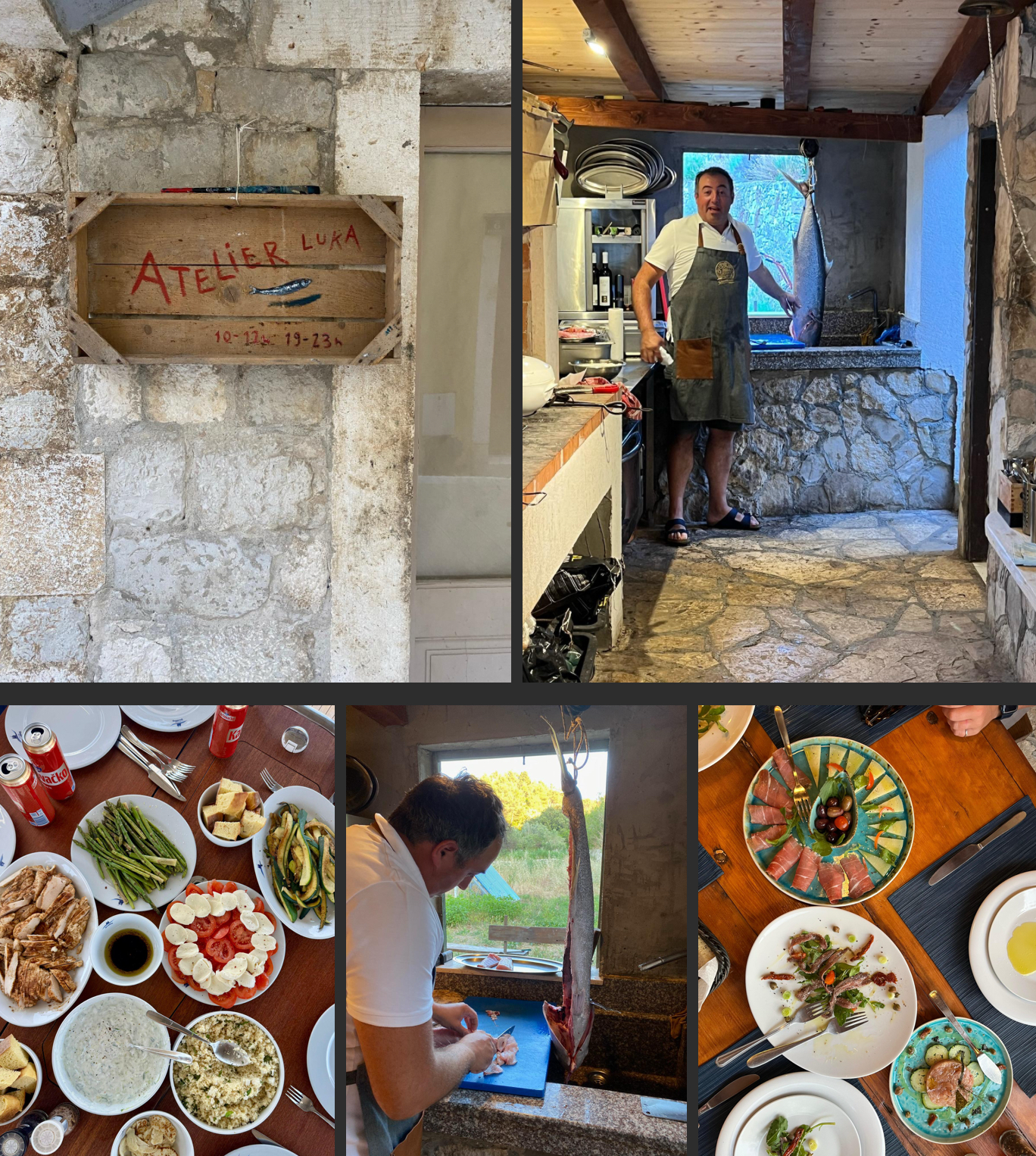 The highlight of the week came when we heard whispers on the pontoon about a mythical place, Atelier Luka, tucked down a creek, accessible only by boat and not to be found on google. Undeterred, my family set off to find it. Nestled among the pines, beside the glistening clear water, was a ramshackle hut strung with festoon lights. We were ushered in, two at a time, to view the catch of the day: a freshly caught, two-foot amberjack destined for the barbecue.